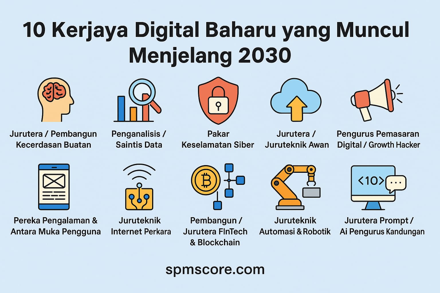 Menjelang 2030, peluang dalam digital tidak hanya untuk lulusan universiti sahaja. Lepasan SPM yang proaktif — belajar kemahiran yang betul, bina portfolio, dan mendapat pengalaman praktikal — boleh memasuki bidang teknologi yang berkembang pesat. Pilih satu atau dua hala tuju (contoh: AI + data, atau keselamatan siber + awan), bangunkan kemahiran asas dan cari peluang latihan. Sumber-sumber global dan laporan industri menegaskan bahawa permintaan untuk peranan berasaskan teknologi akan terus meningkat menjelang 2030.