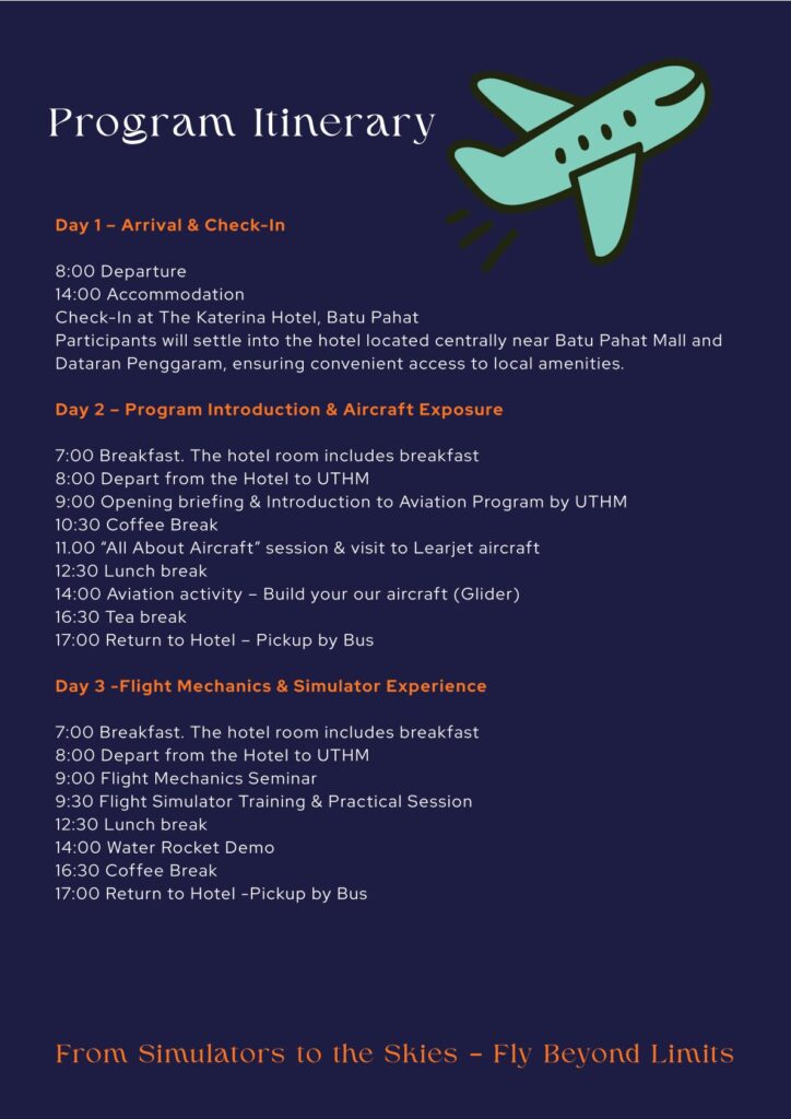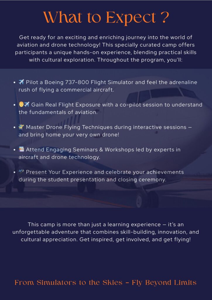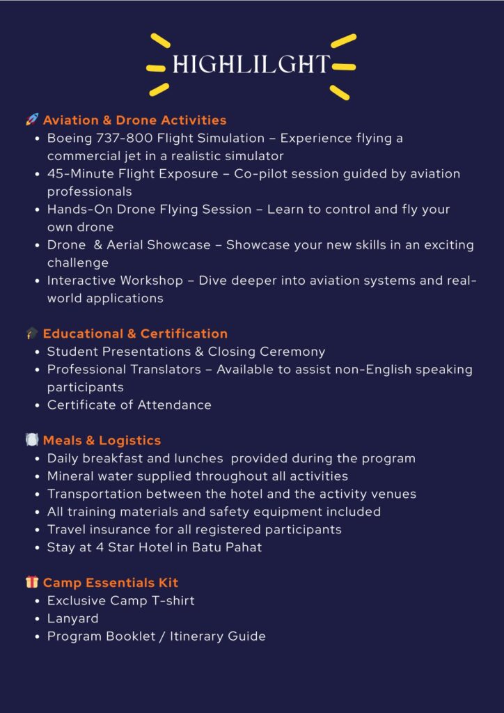 Skybound – The Aviation Camp bukan sekadar program santai musim panas — ia adalah platform pembelajaran dan peluang profesional awal yang dibina untuk menginspirasi generasi muda ke arah kerjaya dalam dunia penerbangan dan teknologi mutakhir. Dengan aktiviti hands-on, seminar industri, pengalaman penerbangan sebenar dan suasana pembelajaran global, ia merupakan peluang yang menakjubkan bagi belia yang ingin fly beyond limits.